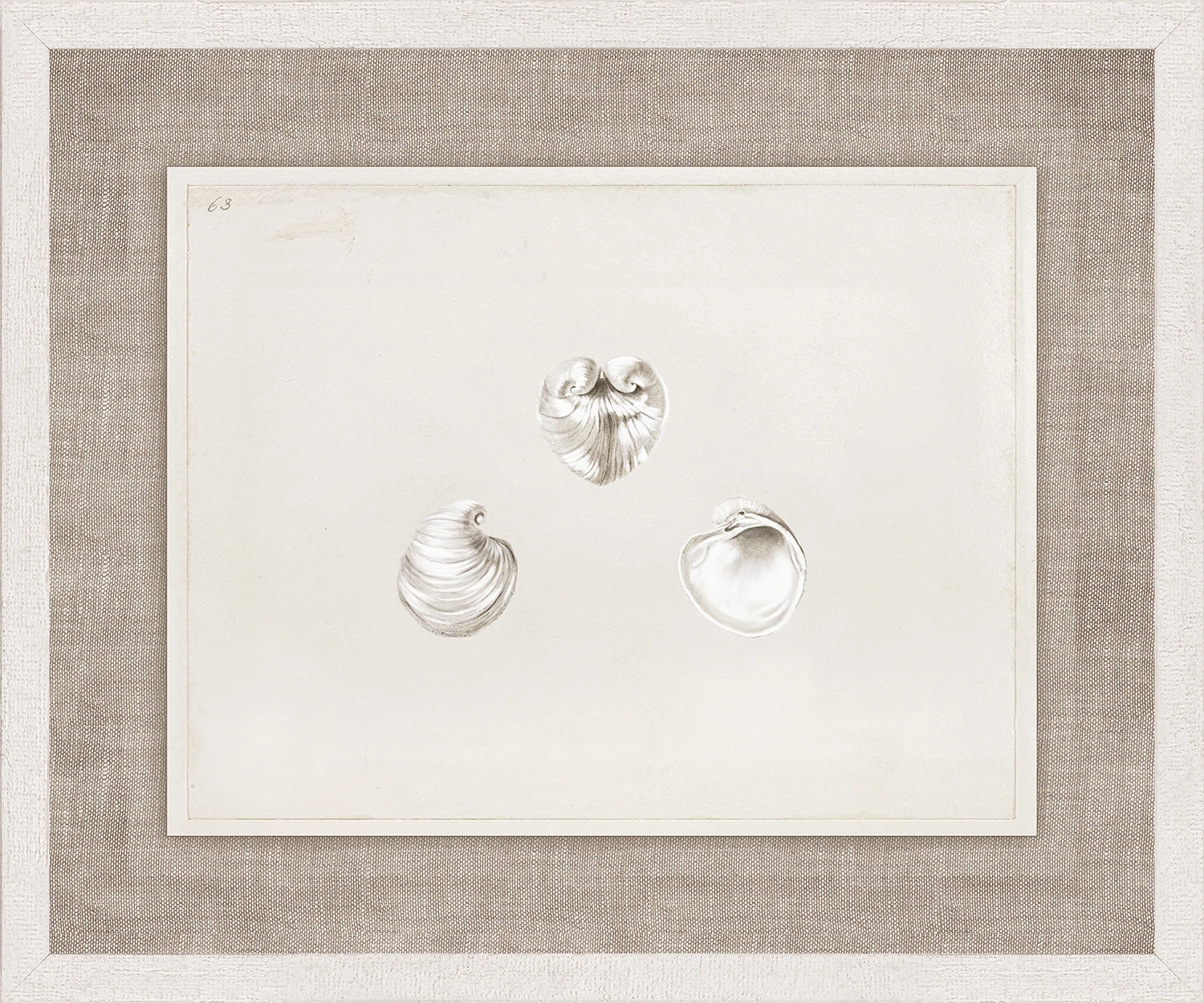 Precious naturalist illustrations of various seashells presented in a historical style with aged paper and hand written numbers. In a rustic white wood frame with a rippled texture.