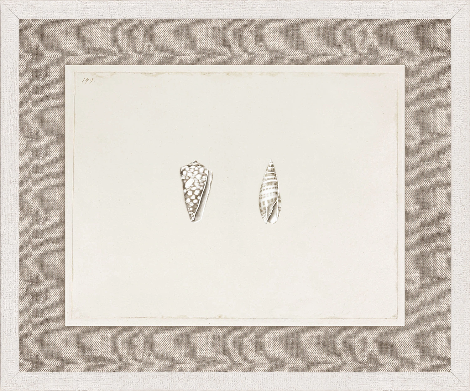 Precious naturalist illustrations of various seashells presented in a historical style with aged paper and hand written numbers. In a rustic white wood frame with a rippled texture.