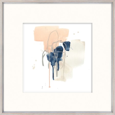 Blush against indigo makes for a pleasing contrast in subtle but energetic little abstract watercolours. Set under a raised matte and framed in a grey profile with silver inner angle. One of four styles.