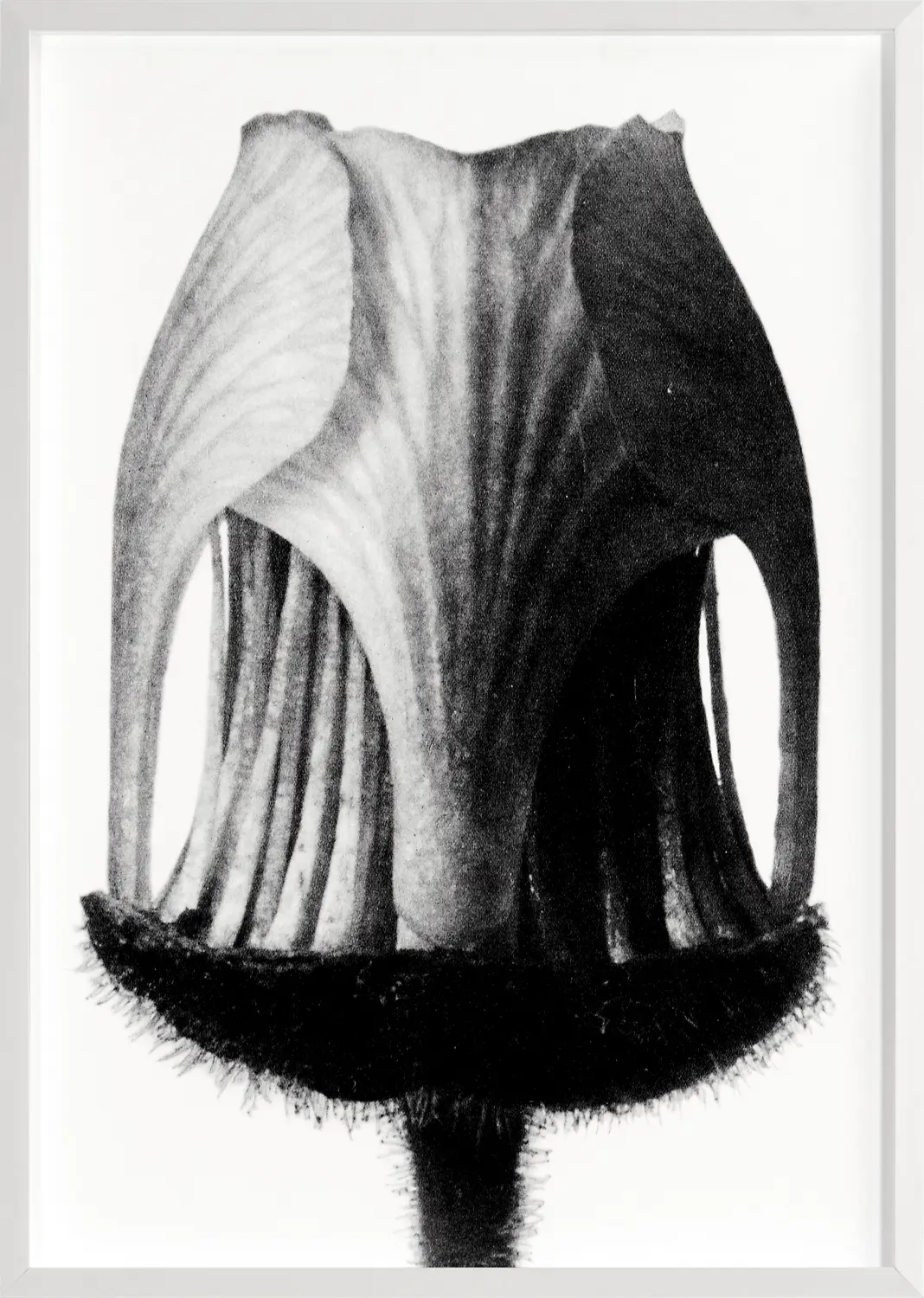 Karl Blossfeldt was a pioneer in photography using home made cameras to create macro images of botanicals. His book ”Art Forms in Nature” was a groundbreaking examination of plant surfaces, and their architectural structures. These two images are powerful examples of his work set on a clean white ground with deep white frame and frame space.