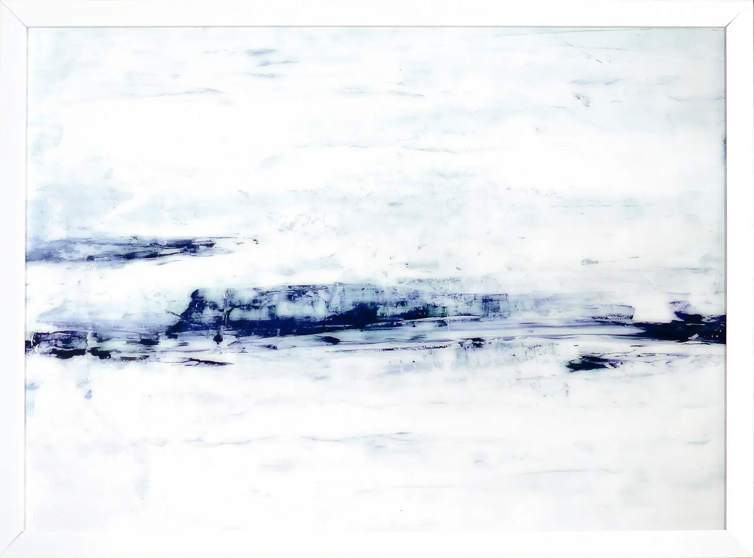 A painterly abstract reminiscent of watery surfaces in on trend fresh white and indigo tones. Finished with a hand embellished gel texture on board for that ‘ canvas ‘ look at a lower price. Framed in a deep white frame.