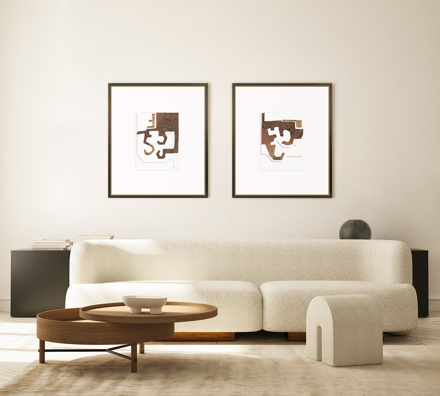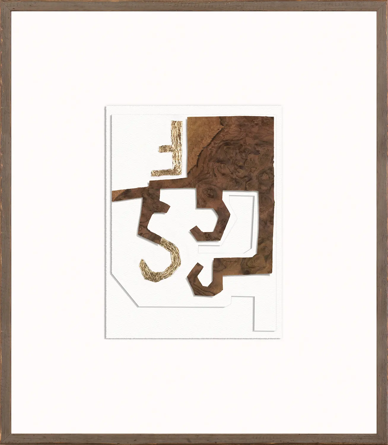 In these paper collages, Gayle Harismowich was inspired by the work of Spanish sculptor and painter, Eduardo Chillida. His architectural training was evident in the use of the solid versus the void. The underlying structural organization is so very pleasing. Gayle has elevated her pieces by cutting out the white on white shapes and using a layered double torn edge for depth. Complimented by a deep frame space in a deep, rough, black profile.