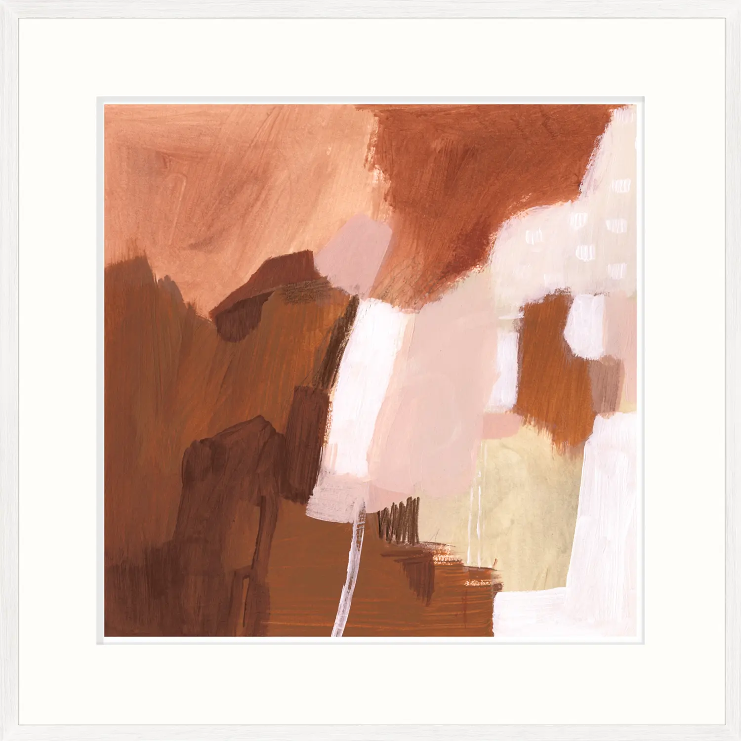 Stunning abstract with shades of rich terra cotta, muted pink, and white. Beautifully presented with matte and white wood frame.