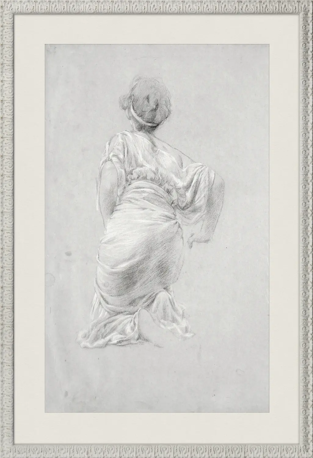 A classically draped figure rendered in white and gray conte pencil on soft gray ground, matted with a pebbled texture matte and delicately carved ivory frame.