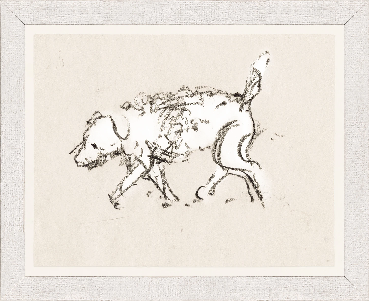 A fun sketch of a dog in motion was originally created by artist Charles H. Woodbury. The loose sketching juxtaposed with the elegant presentation would make this piece fit in with any decor.