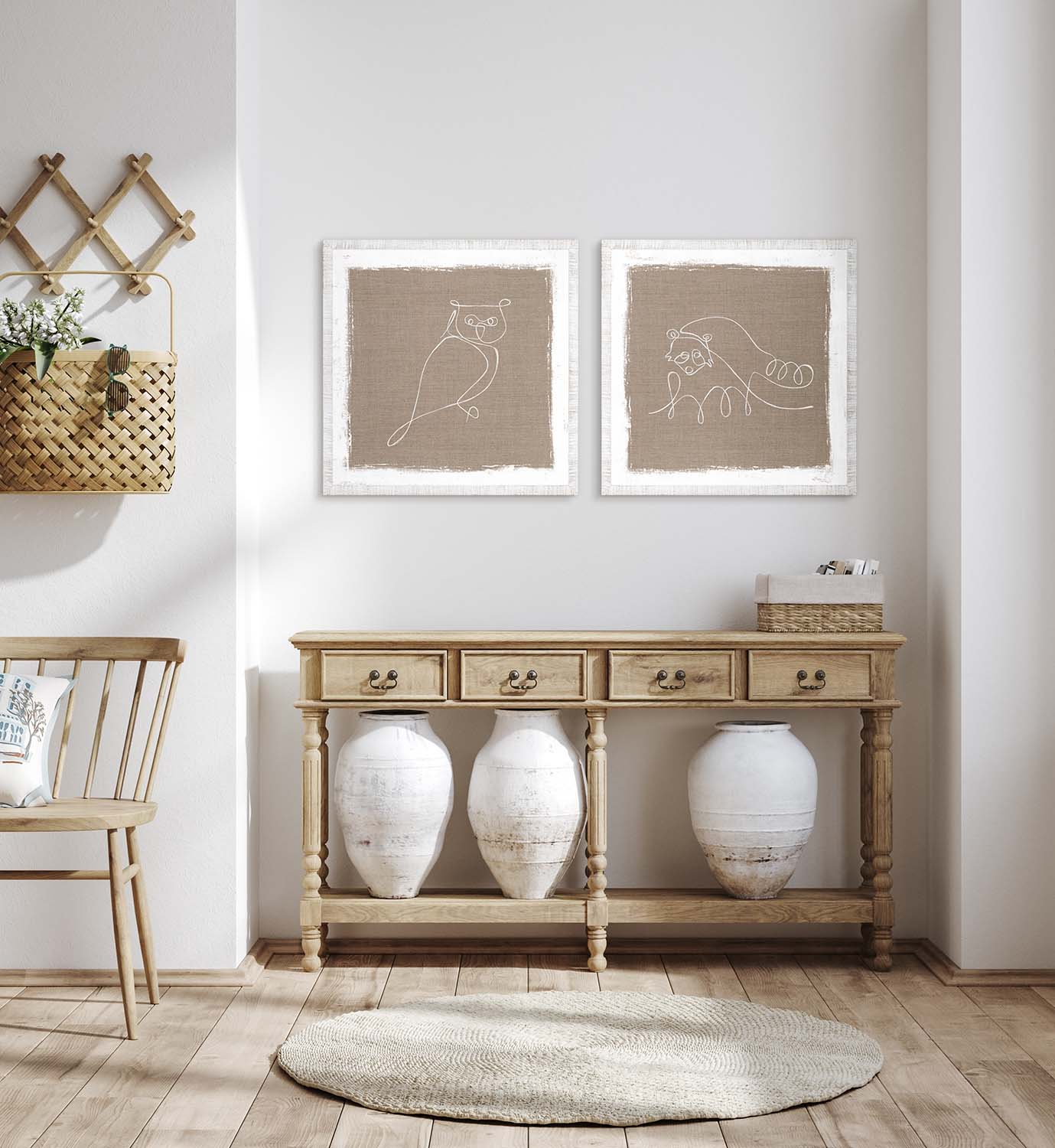 Gestural white lines over rustic textures depict classic North American animals. In a rustic white moulding with a distressed surface.