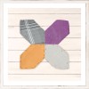 Star-shaped quilted samples with a variety of fabrics and colours, set over a subtly rustic background of painted boards. Framed in a simple wood moulding with a distressed white paint finish.