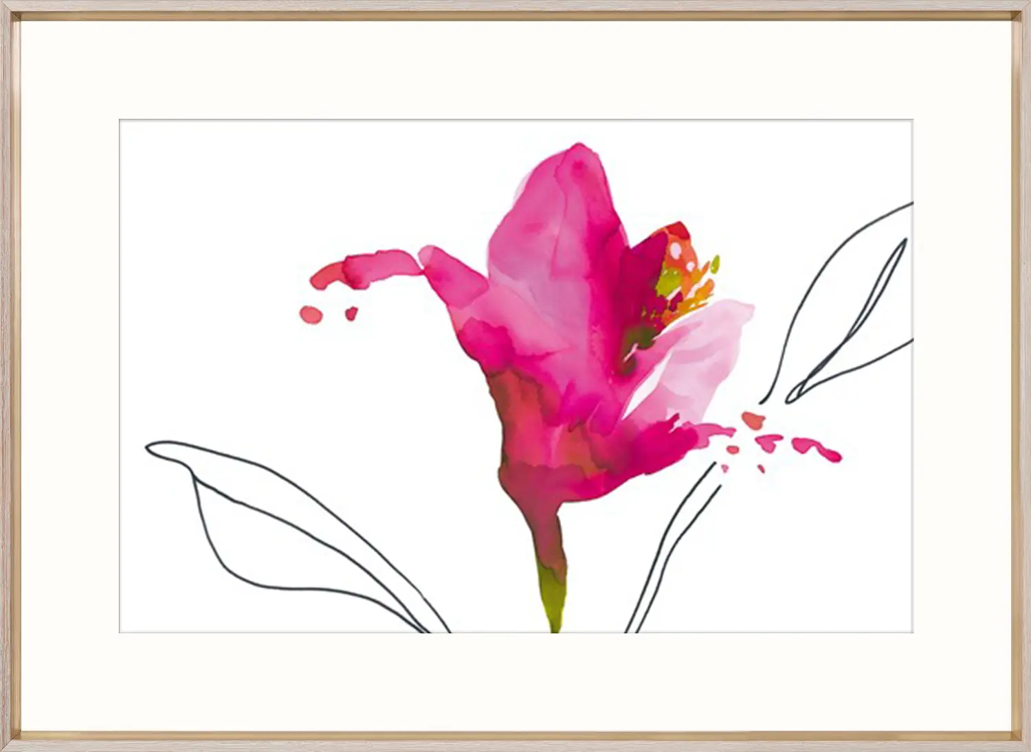 This exuberant hot pink watercolour uses concentrated colour against a fresh white ground to stunning effect. It is set off with gleaming gold gild frame for a punch of fresh colour. One of two matching pieces.