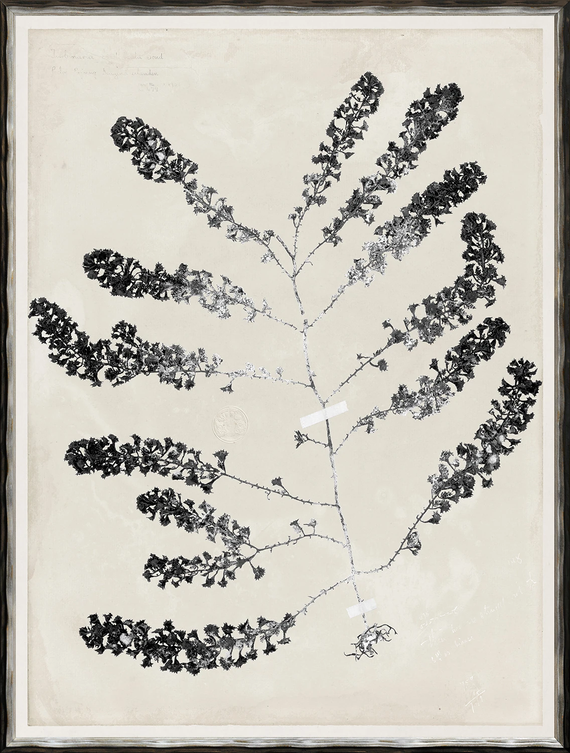 A series of nine botanical seaweed pressings in dramatic black ink against an ivory and taupe ground.