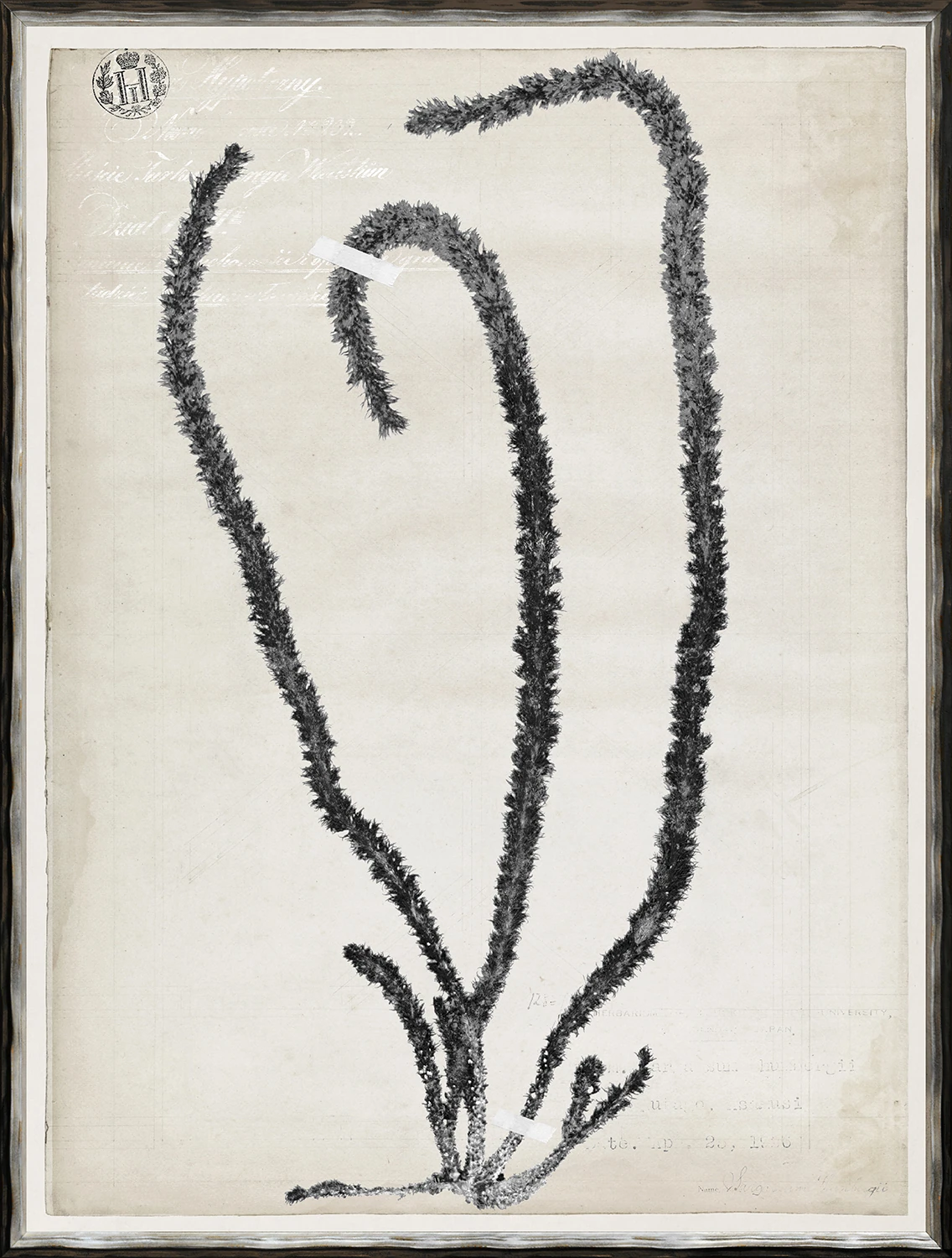 A series of nine botanical seaweed pressings in dramatic black ink against an ivory and taupe ground.