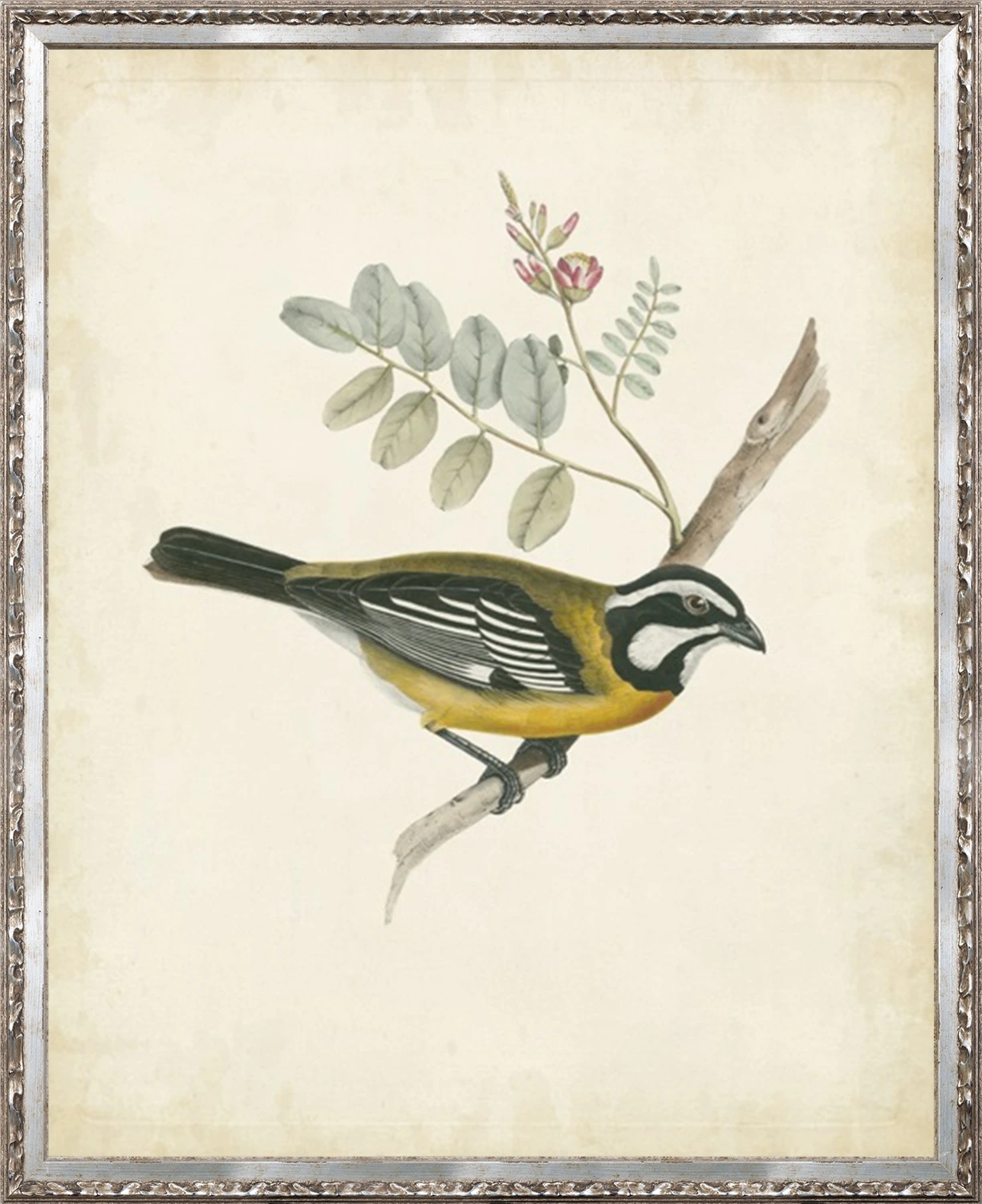 Vintage bird illustrations, delicately distressed on board. Framed in an antiqued silver frame with ornate surface.