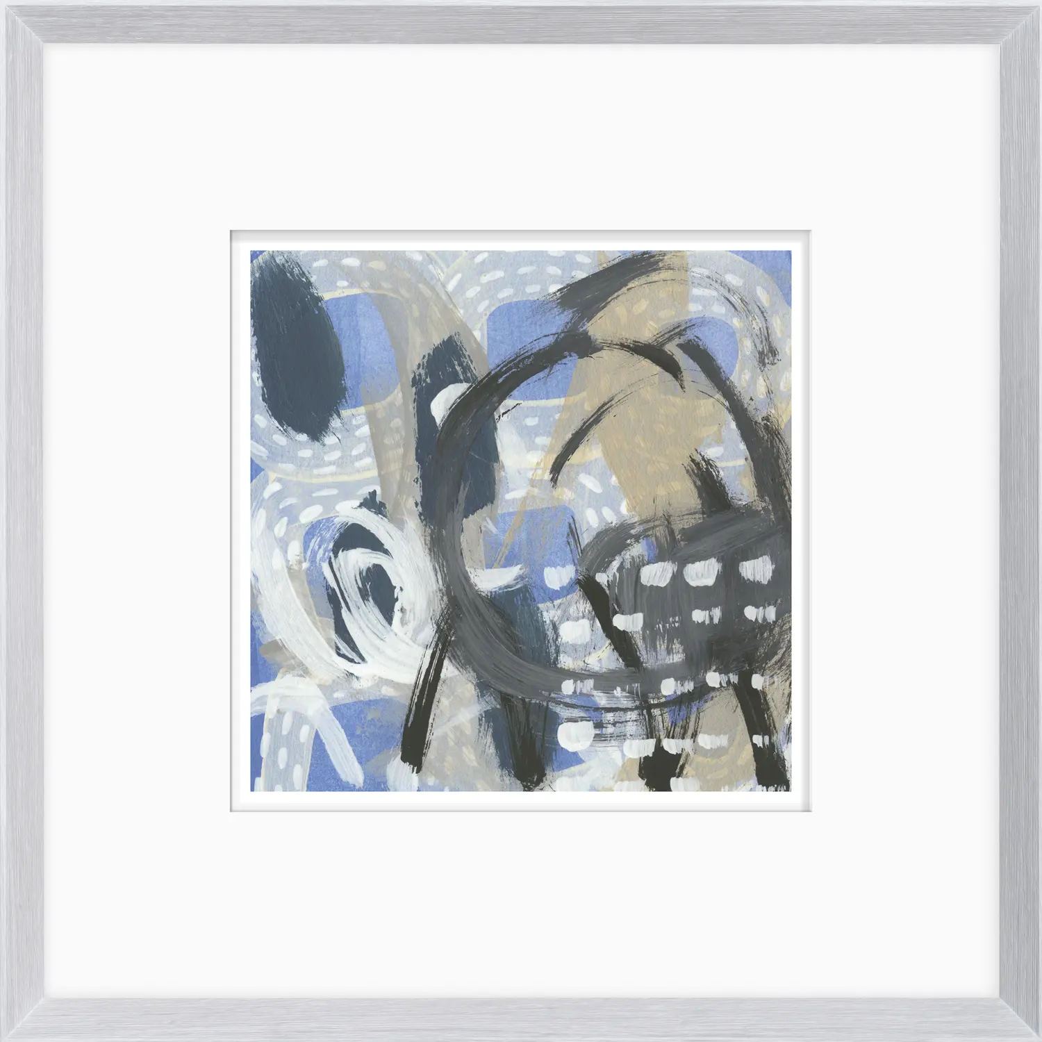 This group of nine abstracts are multi-layered and playful using mid-tone blues, taupes, black and white. Use them individually, mixed into a gallery hanging or as a full set. Finished in a contemporary, angled, white wood frame and wide white matte.