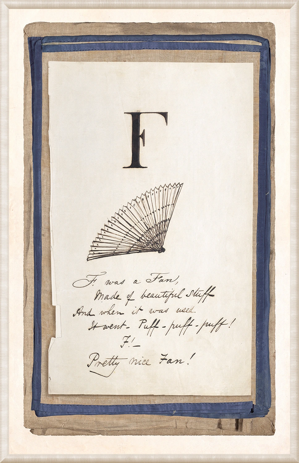The alphabet rendered by Edward Lear, each letter includes an illustration and a playful poem. Finished in a taupe moulding with a linear texture.