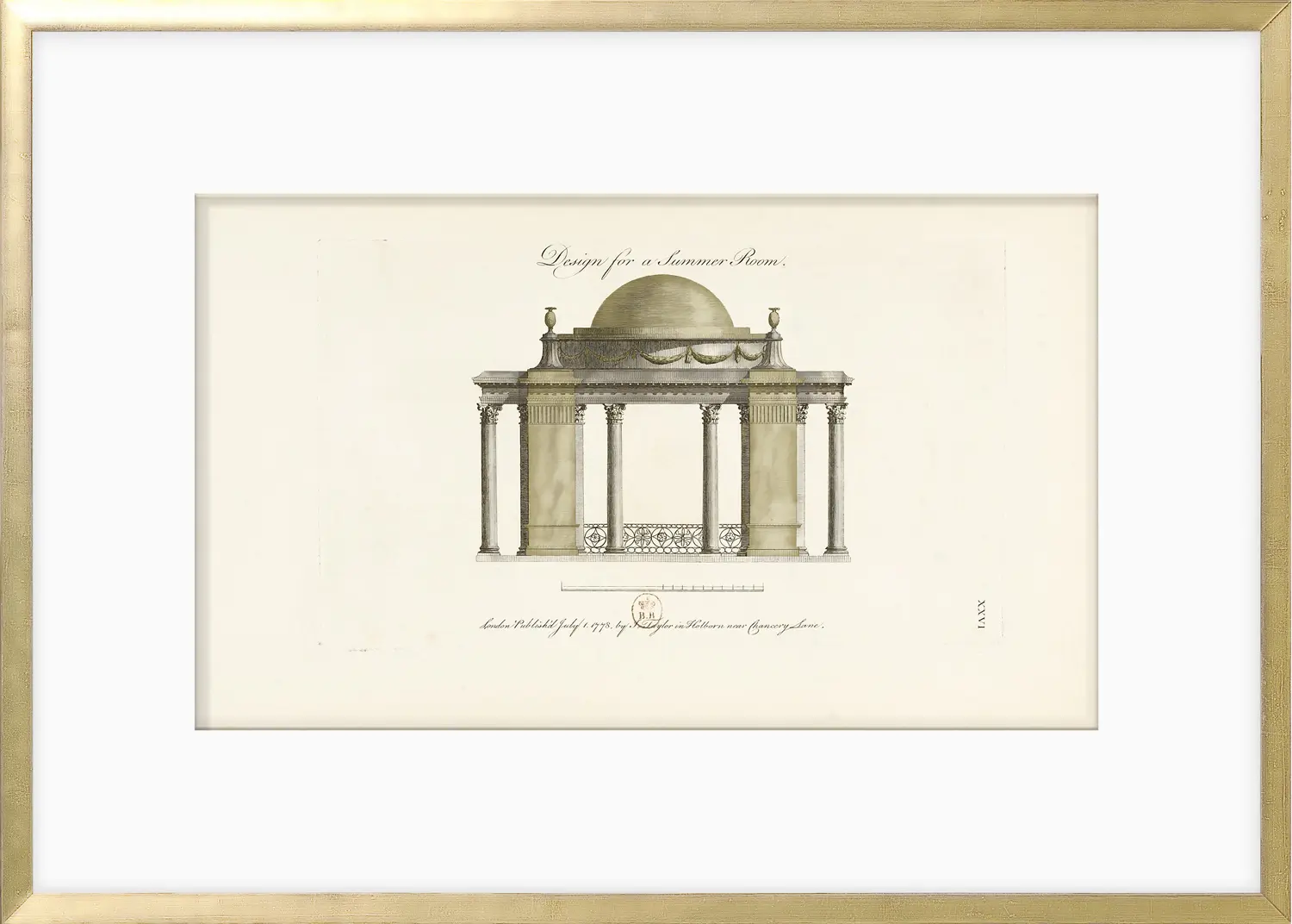 Fine architectural engravings of small garden pavilions and summer buildings.