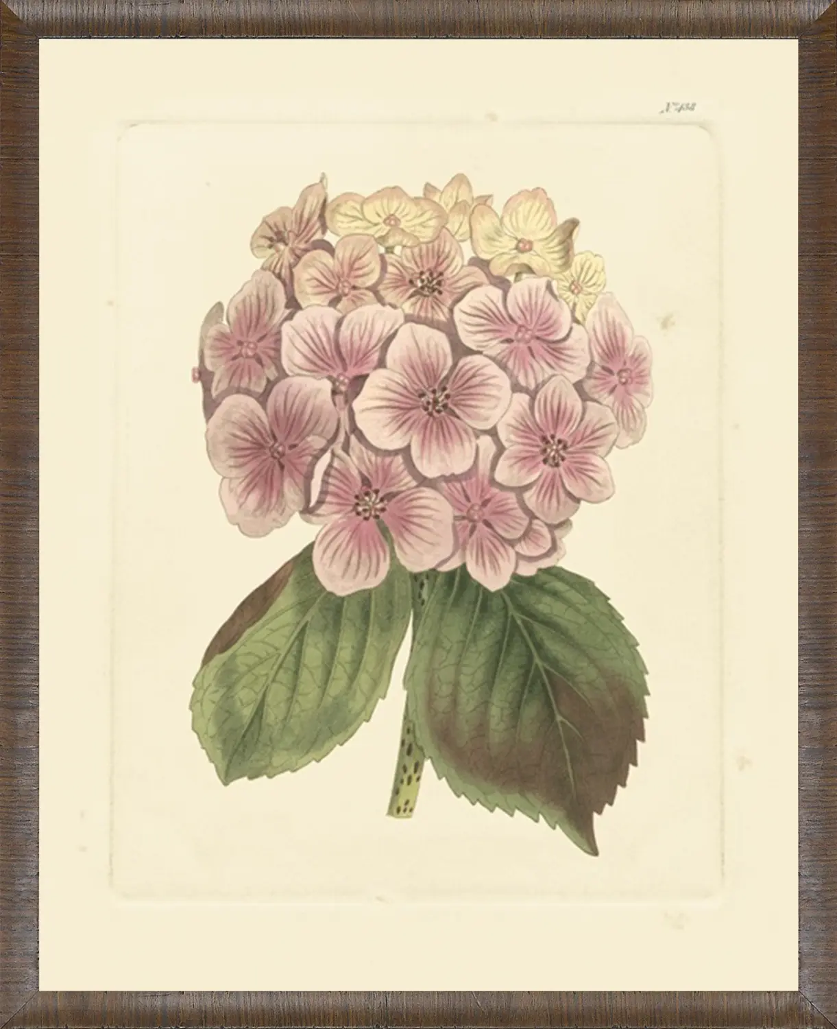 Classic Botanical prints on quality paper for a true historical look. Soft pink, mauve and white peonys, truly, the queen of the garden. Framed in a live edge wood frame. One of six.