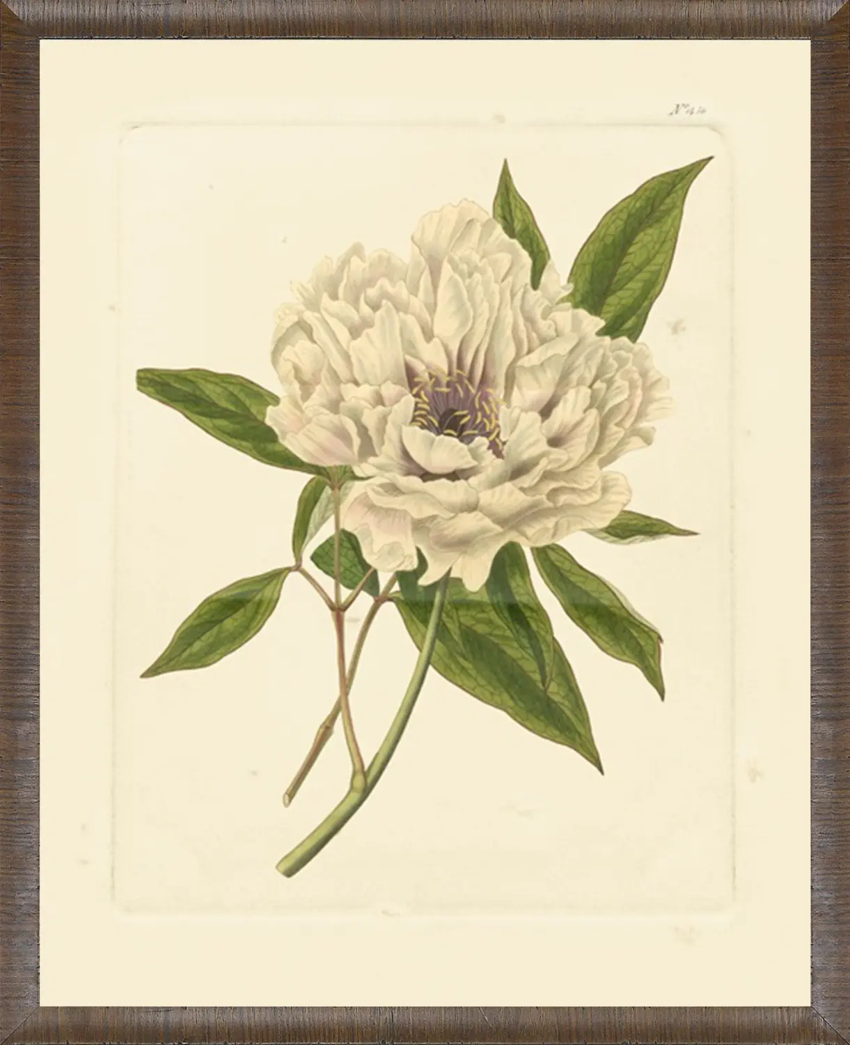 Classic Botanical prints on quality paper for a true historical look. Soft pink, mauve and white peonys, truly, the queen of the garden. Framed in a live edge wood frame. One of six.