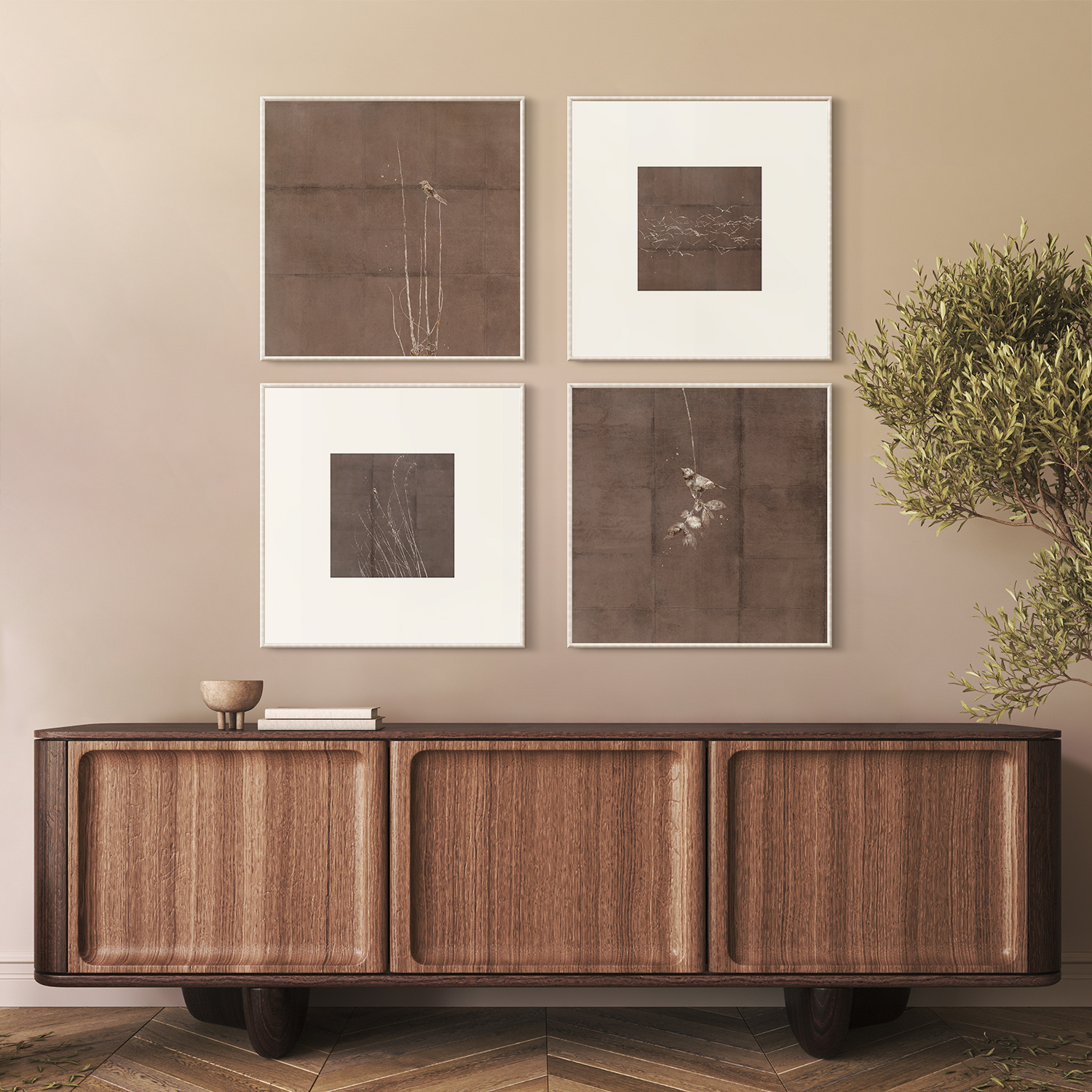 The delicate lines and use of negative space in this print highlight the ephemeral nature of the moment captured within. Thin lines of white and cream outline the shapes of birds and foliage in a variety of settings, standing out against varying shades of brown, creased paper backgrounds.