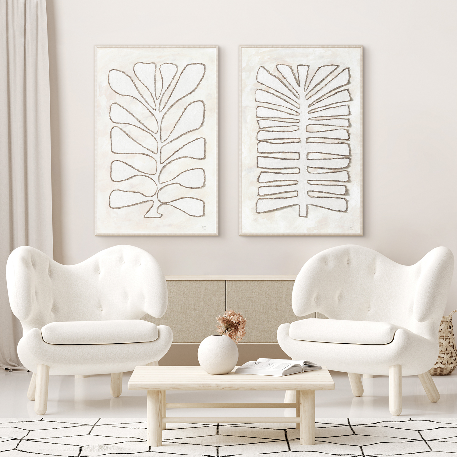 These light and airy pieces feature a variety of abstracted fern designs on a creamy, painted background. The geometric shapes of the ferns are done on linen with a painted surface and frayed edge, casting shadows on the painted ground beneath. These elements are captured with advanced photographic processes and digital enhancements that create a stunning three-dimensional effect.