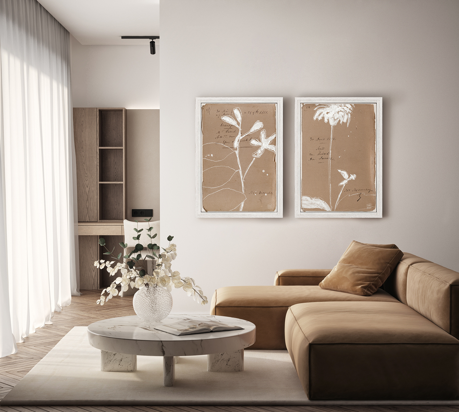 This series of 6 depicts abstract floral paintings on 19th century French Dossiers. White gouache was used to create gestural flowers, while interesting compositional crops give a contemporary feel.