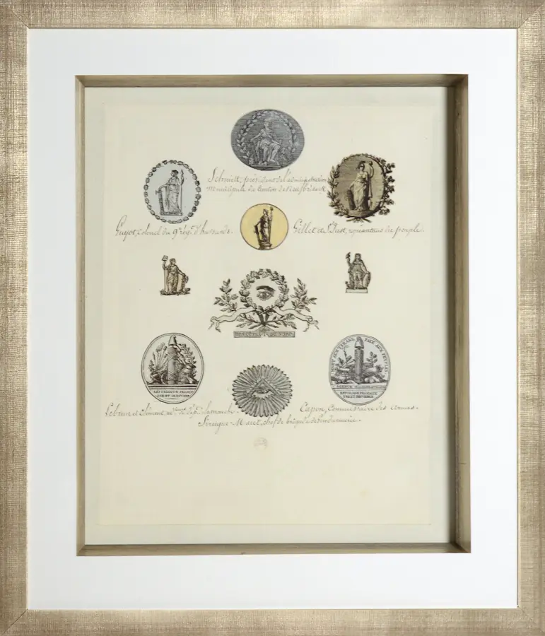 Exceptional historical French document seal. The details of these unique manuscripts include official ring seals and the larger ones which followed. The details have been enhanced with hand embellished, gold painted detail. Set within an inside double frame with linen textured matte and gold textured outer frame.