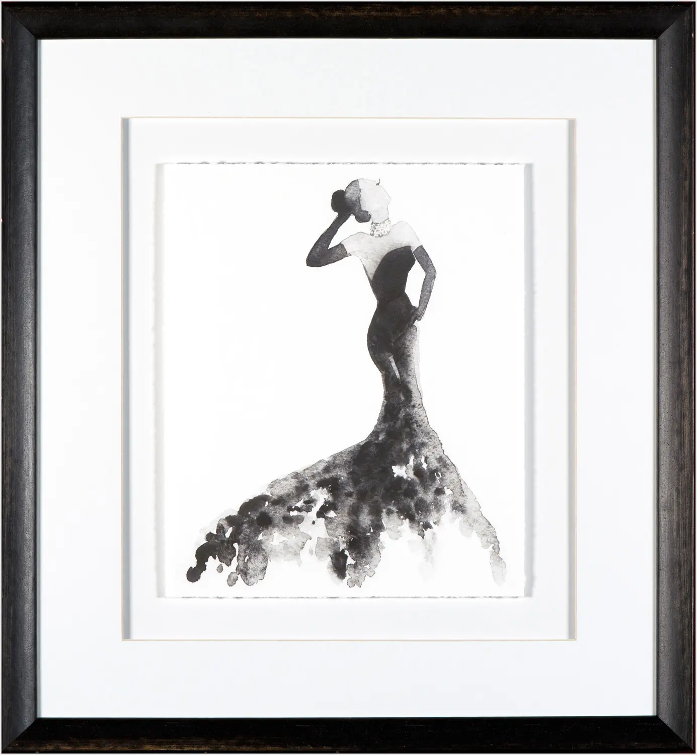 Graceful high fashion ink drawings in a contemporary format utilize the power of negative space for big impact. Beautifully framed with raised image and matte, torn edge and an antiqued black frame, Audrey Hepburn would have definitely approved.