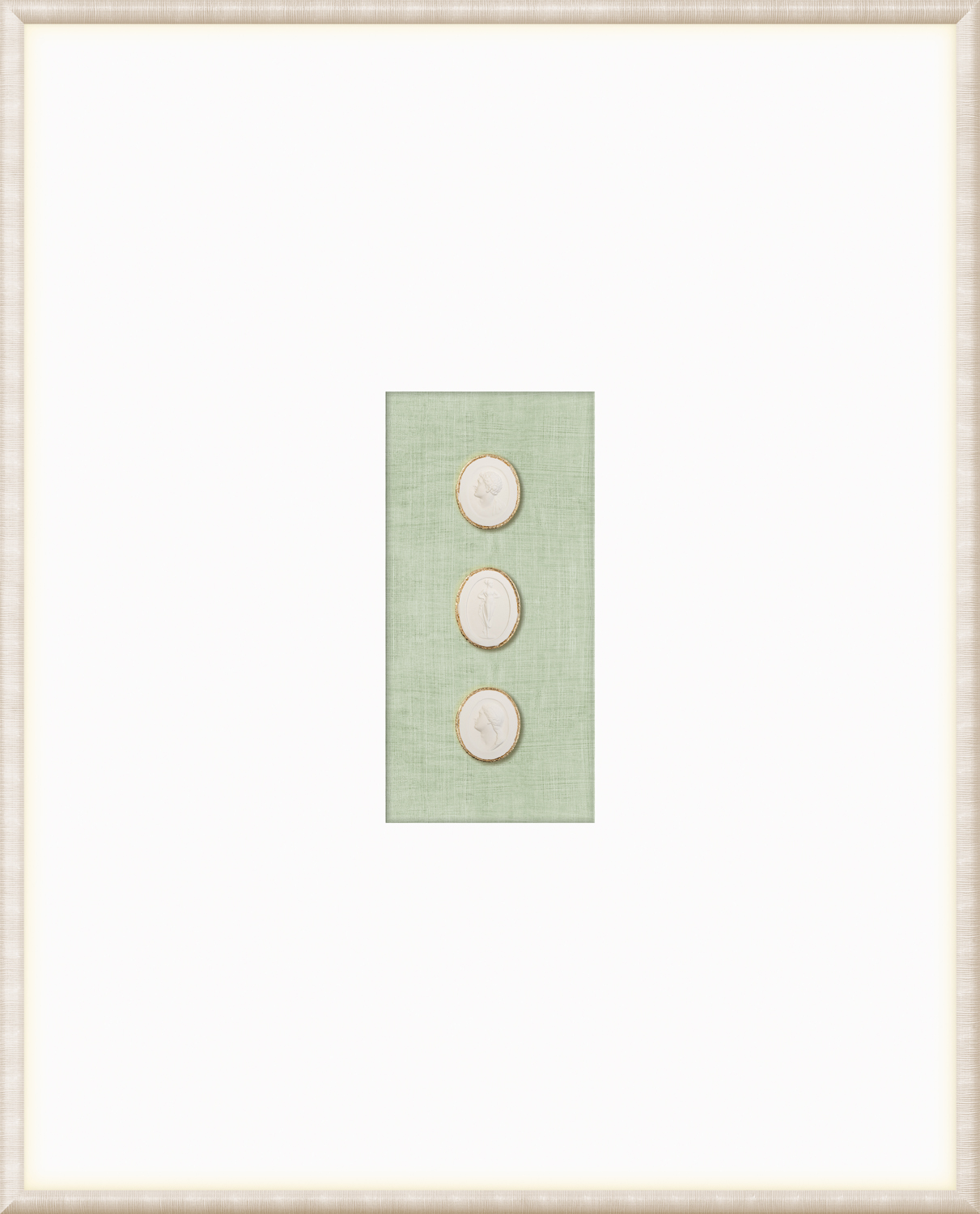 Our collection of Intaglios features both mythological and historical figures. Each one is hand-cast and gilded with fine gold filigree along the upper edge, framing the carved images and making them truly unique pieces. Each grouping is mounted on a linen texture background in a variety of colour options. They are framed in a light, neutral-toned moulding with a striated texture and a wide, raised matte with gilded framespace, giving them even more elegance and luxury. With our wide variety of arrangements and different combinations of Intaglios, you’re sure to find the perfect groupings for you.