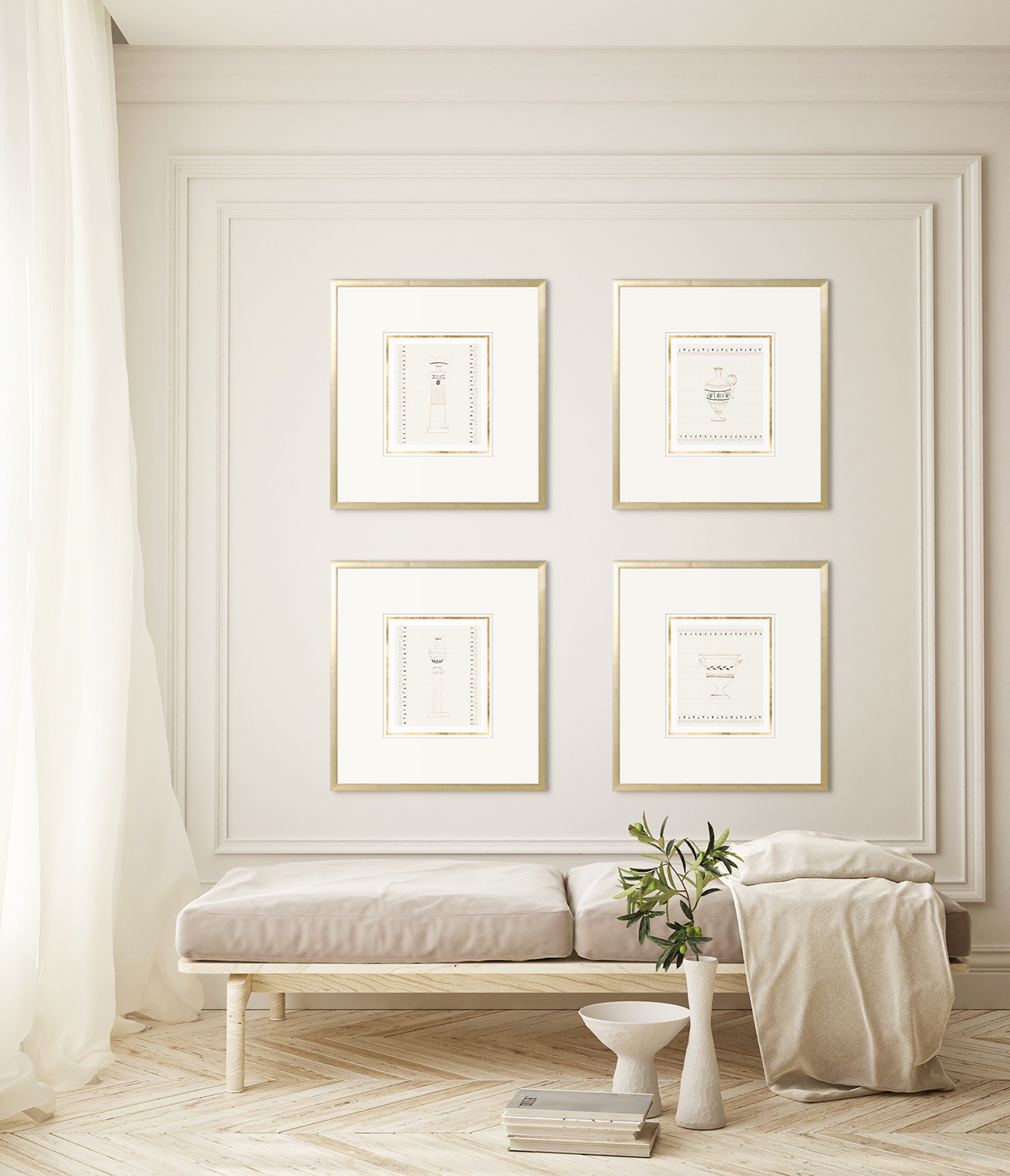 These delicate ink drawings of various urns and other vessels are beautifully hand gilded in gold. The thin gold frame, along with the gilding reflect any ambient light in their environment.