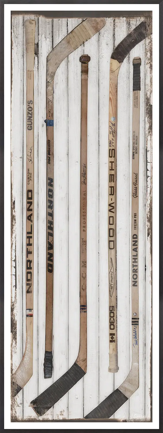 These treasured Hockey sticks of the elite “500” club are all so different, from the warm wooden Northlands and Sher-woods of the old timers like Gordie Howe and Stan Mikita to the cool aluminum of Wayne Gretsky and the space age composite of Jarome Iginla. Chipped blades and original tape from years of play make these deep frame space displayed compilations a treasure trove of insider intel and will be sure to find a favoured spot on any hockey fans wall.