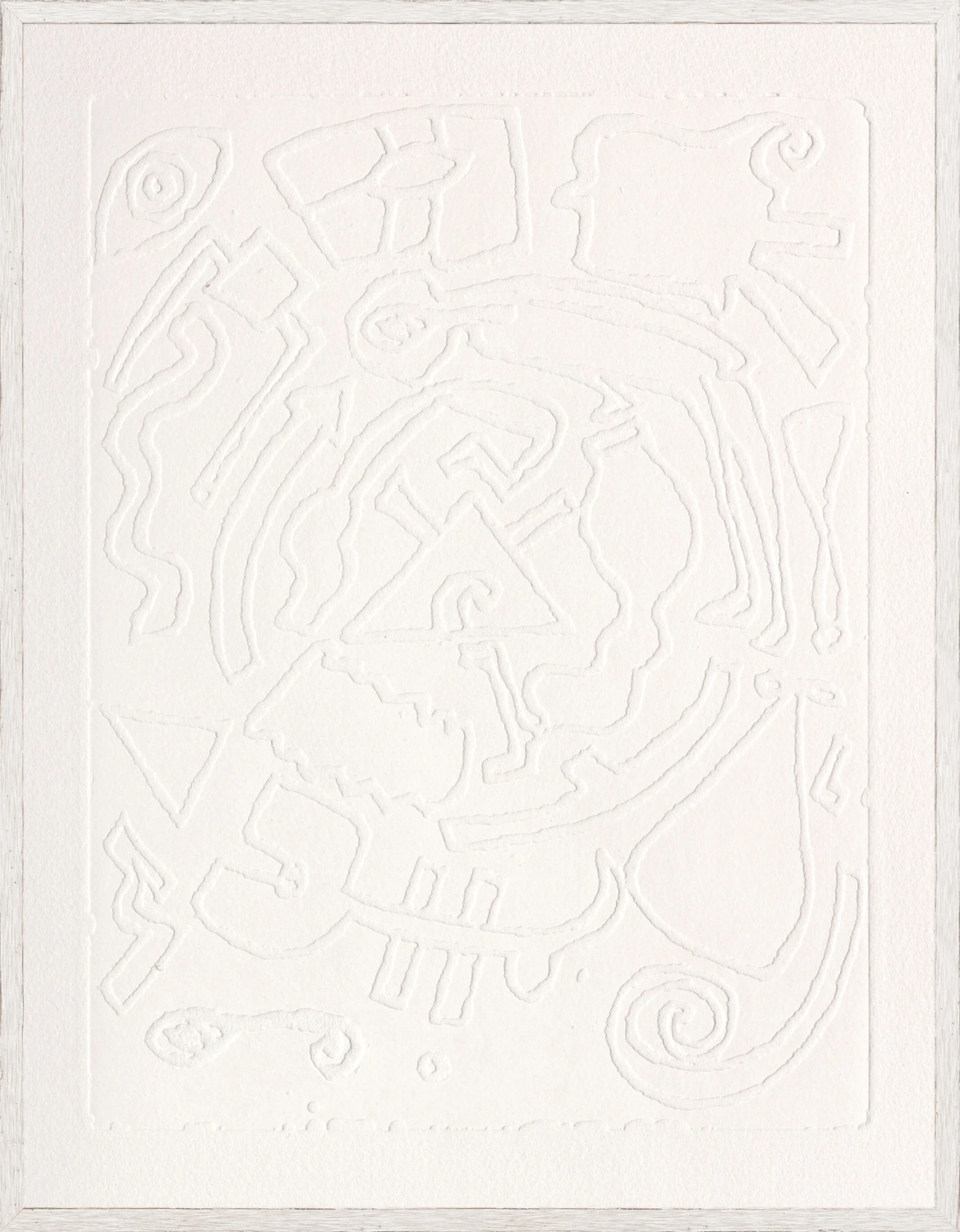 The subtle texture of embossed paper reveals intricate geometric patterns in this delicate piece. The texture and colour of the paper take center stage, using only light and shadow to reveal the image within.