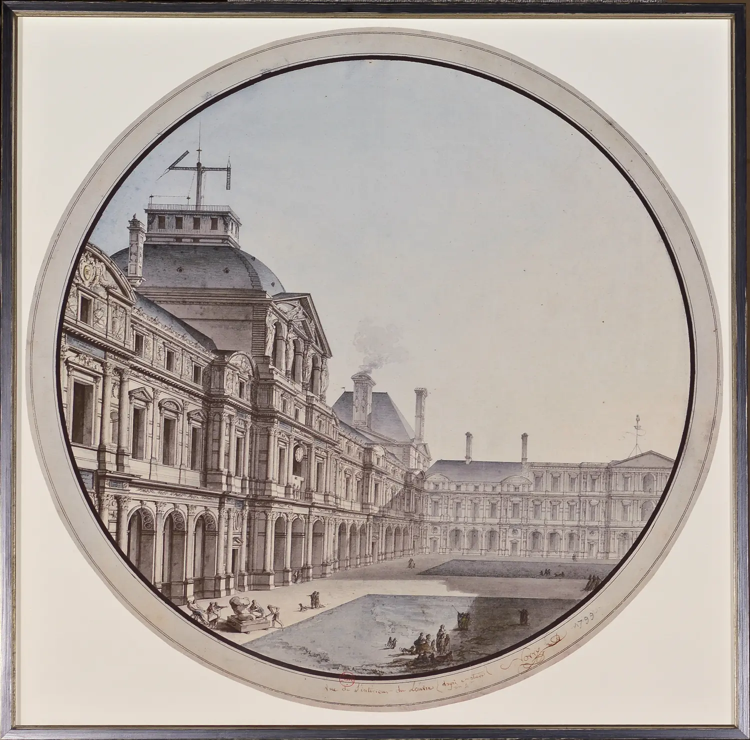 A finely detailed, historical etching of the interior courtyard of the historic Louvre in Paris from 1799 in an unusual circular composition.