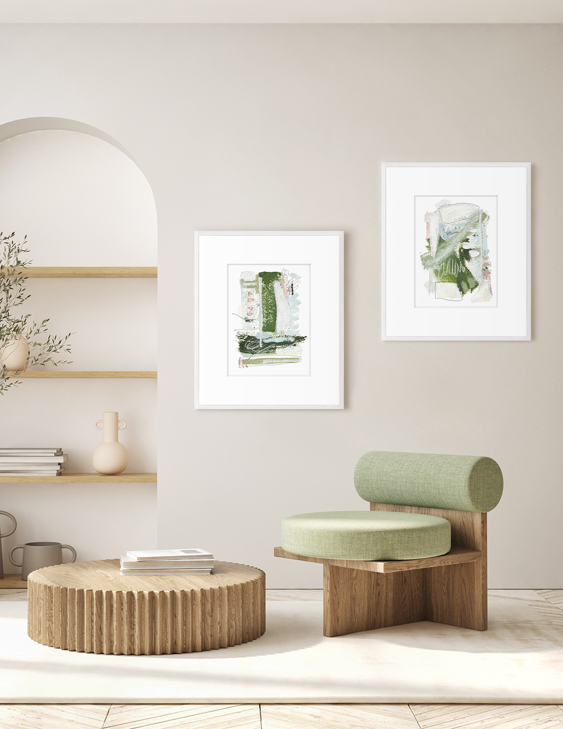 A highly textural and organic piece using whites, rich greens, and soft pastels as accents. The addition of fabric texture and both light and dark line creates more interest to guide the eye through the image. Framed with a simple white wood moulding.