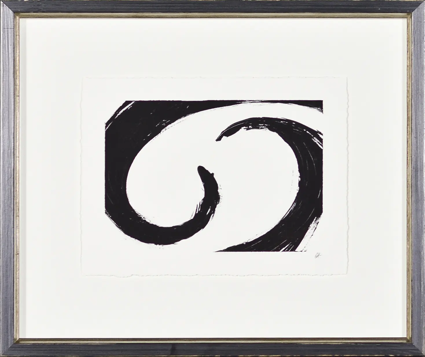 A graphic and energetic black and white abstract with fine torn edges, deep frame space and raised image. The fine distressed black frame with antiqued silver inset complements perfectly.