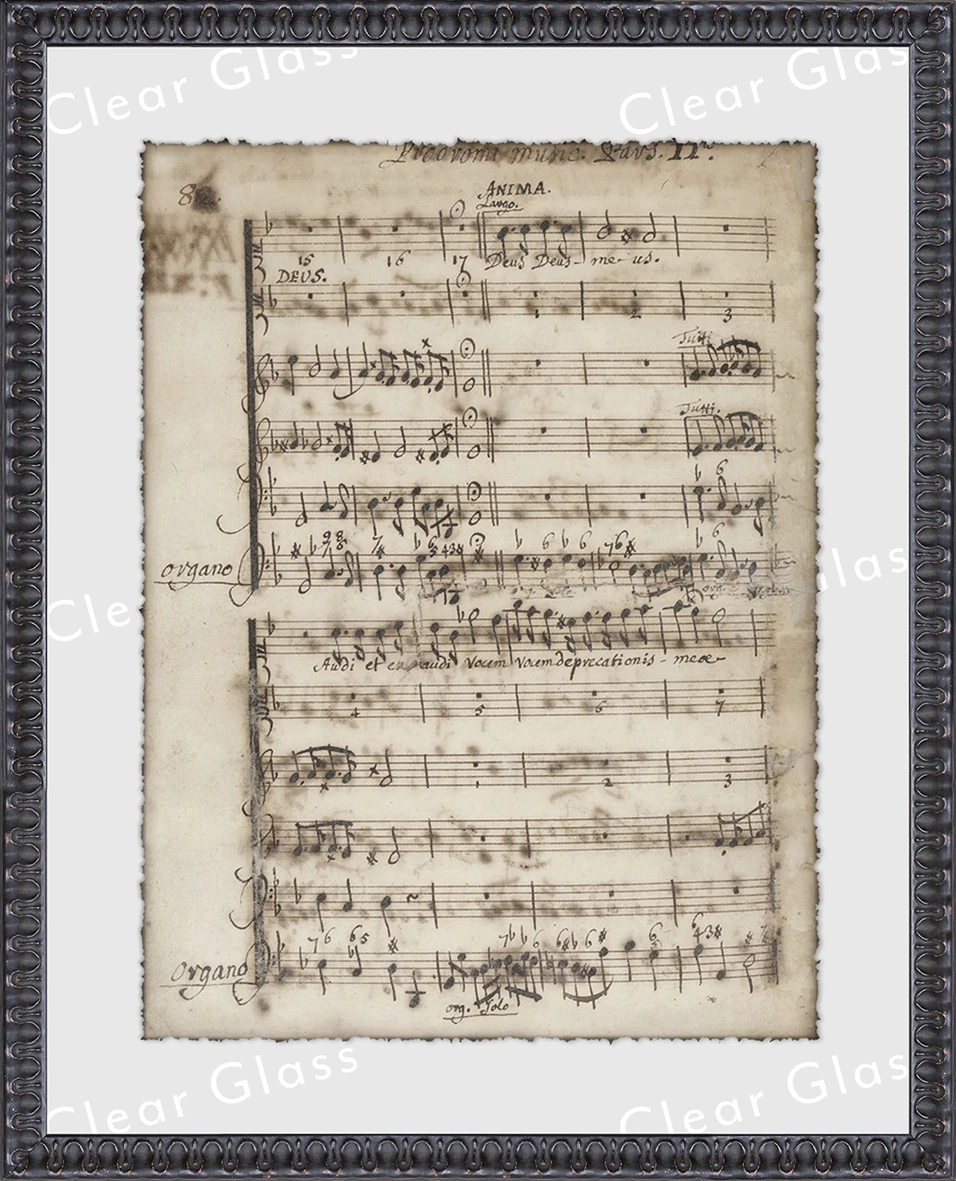These historic, Latin music sheets lay between 2 sheets of glass and appear to float in their delicate beaded and antiqued frames. A series of eight, the torn edge of each piece gives a truly unique appeal.