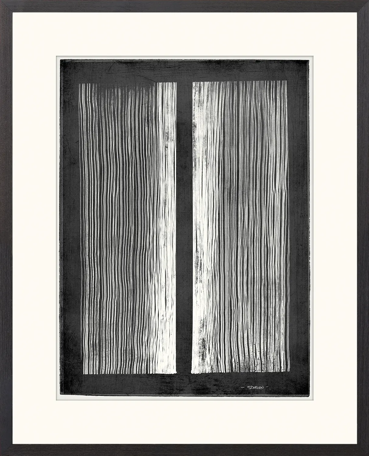 A versatile and graphic black and white abstract perfect for group hangings or gallery style mix ups. Framed in a distressed black wood frame and white matte.
