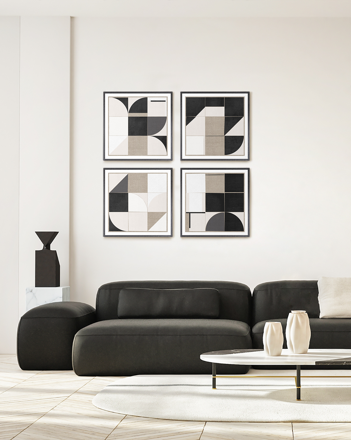Linen in geometric shapes of different textures and neutral colours layered into a grid. Repetition and variation across the structure of squares creates intrigue and moves the eye through the image. Framed in a rippled black moulding.