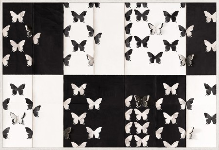 Black and white butterflies create patterns on contrasting, paper-textured backgrounds while hand-cut and crinkled paper butterflies bring an extra element of dimension to this whimsical piece.