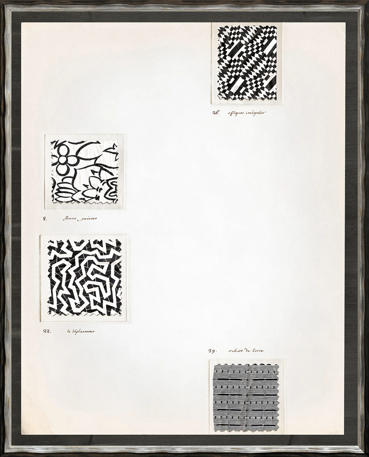 A dynamic sampling of French black and white fabric samples offers pattern within pattern. Arrange within a grid or hang individually for a contemporary vibe.
