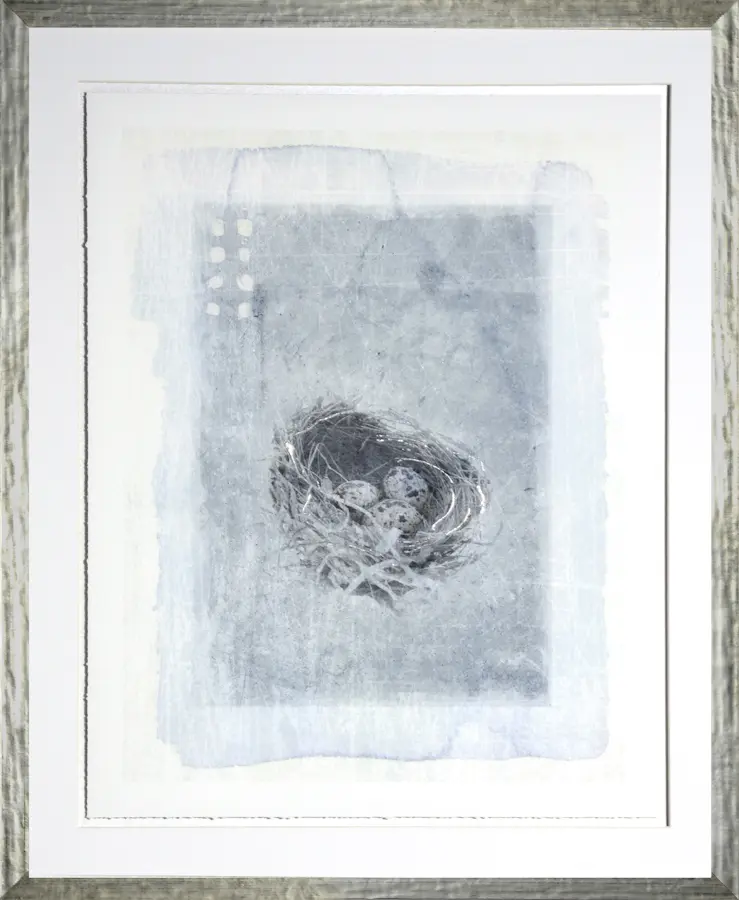 Photographs of precious little nests, symbols of comfort and stability are set against a scratched and water washed, Wedgewood blue ground. Framed with a raised matte and torn edge in a fine silver profile.