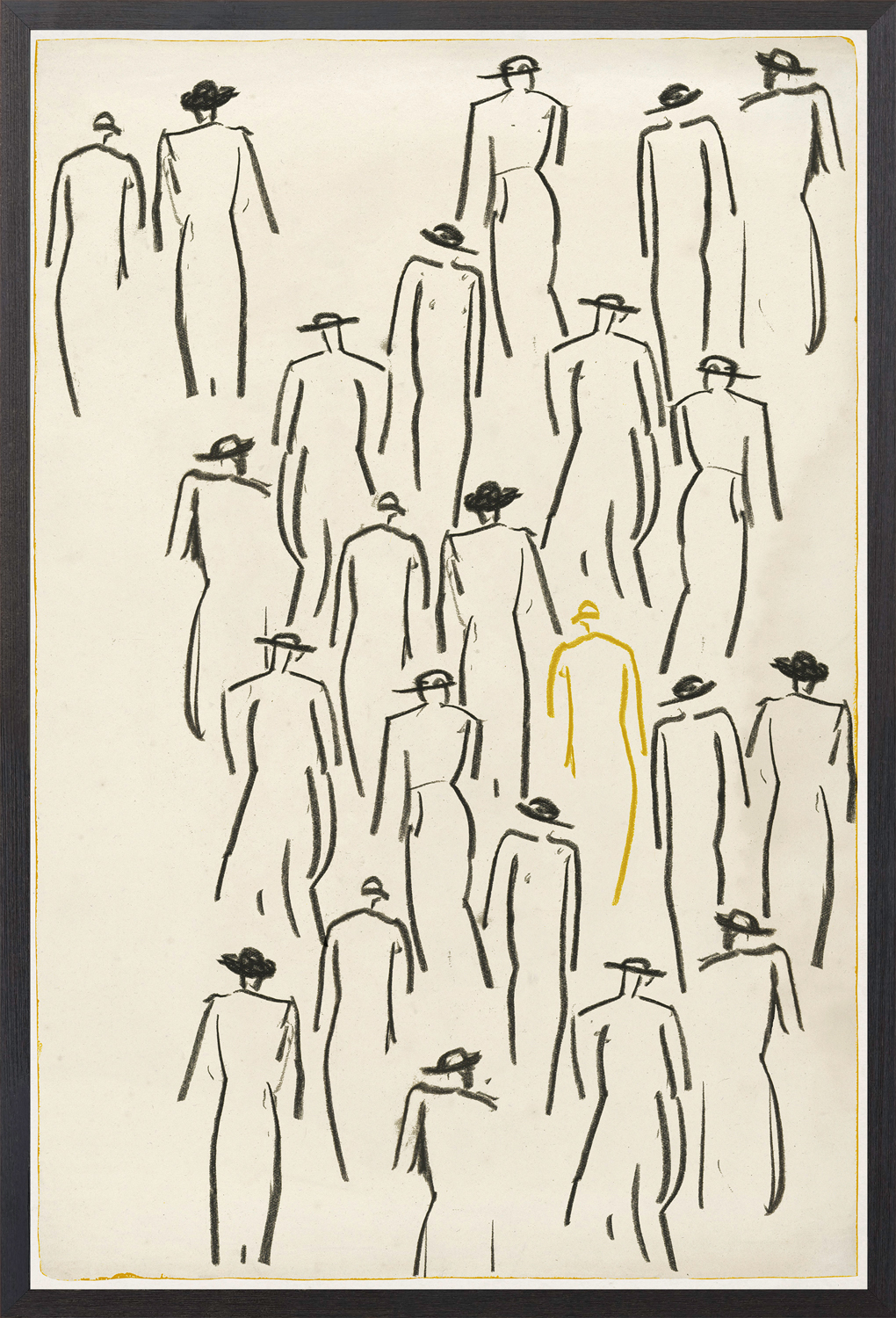 A handsome chalk drawing by Leo Gestel. A group of men walking, all drawn in black, with One Man standing out in the crowd through the use of a beautiful deep yellow. In a deep frame with open-grain dark wood, available in two sizes. Note: A great complement with the Maze & Lines pieces.