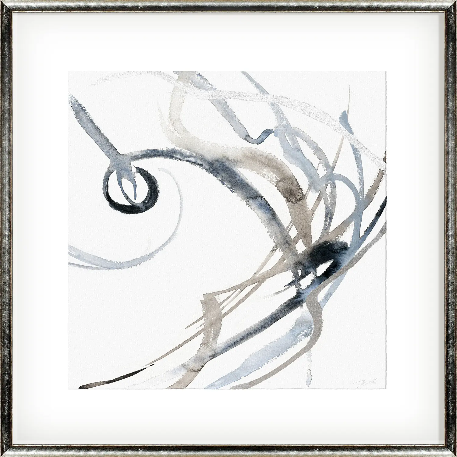 Lyrical water colour lines appear to be set to music as the brush strokes play across the paper in Pearce’s Outreach Entwined. Tones of taupe and grey are accented with subtle lines of silver gild. The piece has torn edges, raised image and deep frame space to make it a truly special. It is framed in a greyed wood profile with polished silver face.