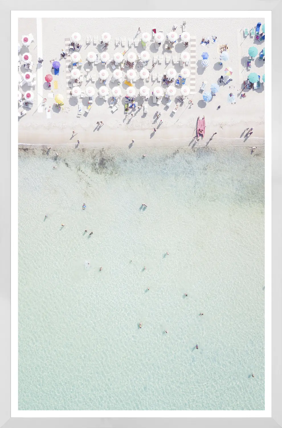 White sand and pastel aqua waters beckon in this aerial photo of a sunny and obviously hot coastal scene. Bright touches of pink and blues accent the atmosphere…such fun. Framed in a clean, white, deep profile.