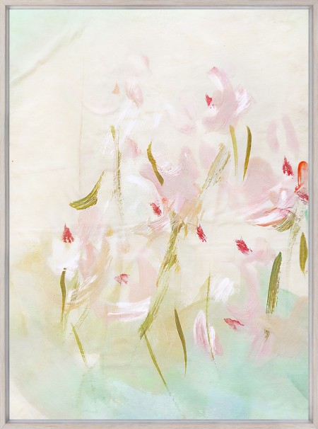 This series of three abstract florals feel like bouquets tossed into the sunshine. A loose painterly style sure to lighten your step, each hand embellished with a flourish of paint. Finished in a gray washed profile with a silver gilded, angled, inner edge.