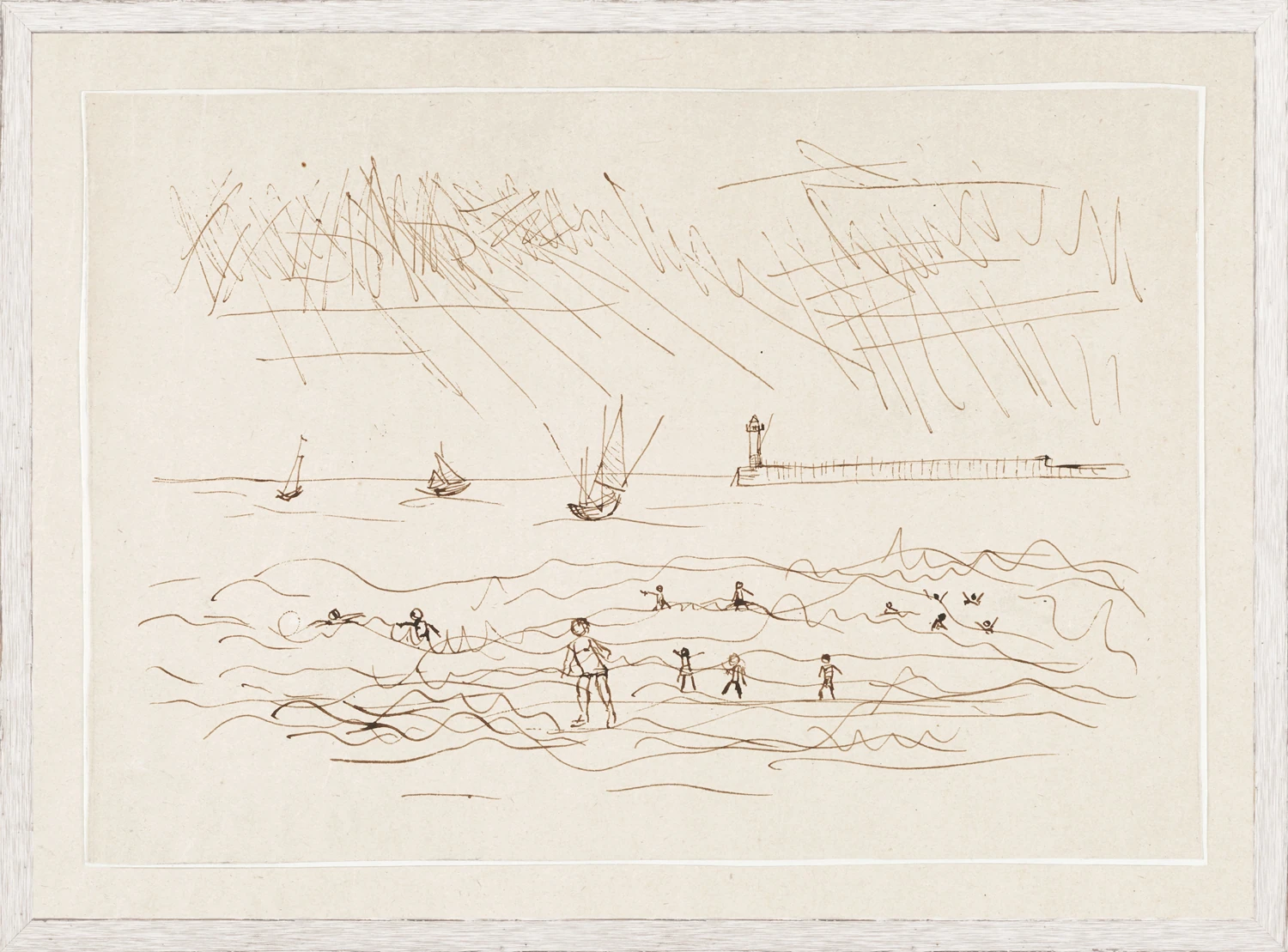 C. 1918 pen and ink seaside set of four sketches capture the effortless charm of coastal leisure. Expressive strokes bring the waves and sand to life, while the sepia-toned ink evokes a sense of calm and nostalgia. The spontaneous flow of ink adds depth and movement, creating an impromptu yet timeless portrayal of sea and summer fun.