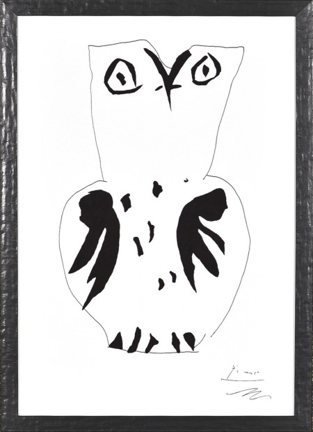 This whimsical Owl ink drawing by Pablo Picasso will add character to any contemporary decor. Framed in a textured black frame.