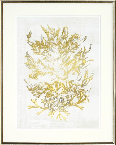 A careful composition of delicate seaweed embellished with touches of gold and silver gild will beautifully grace any decor. It is enhanced with a distressed grey wood frame with polished silver face and neutral matte.