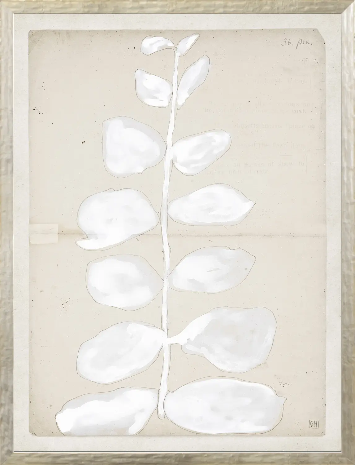 This intriguing series of white-on-neutral drawings of playful shapes and images are executed on restoration paper to add an extra depth and interest. White paint and pencil generate an eclectic group in two sizes.
