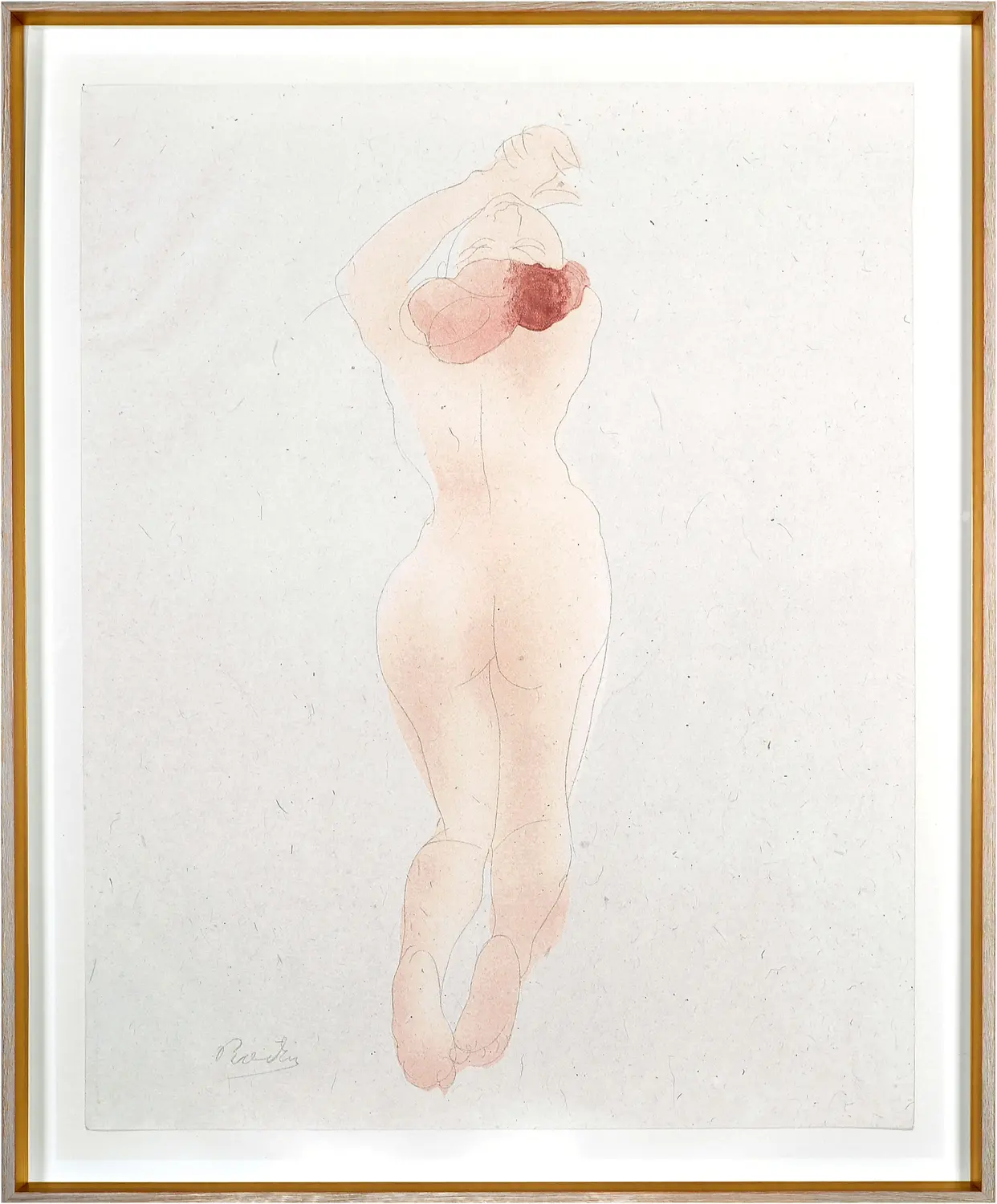 French artist Auguste Rodin is best known for his magnificent sculptures. The internationally known “The Thinker” is just one of those. This delicate and eloquent blush toned watercolour is an example of the hundreds of beautiful renderings this genius produced. It is framed in a beautiful gray washed finish with highly polished gold inside face.