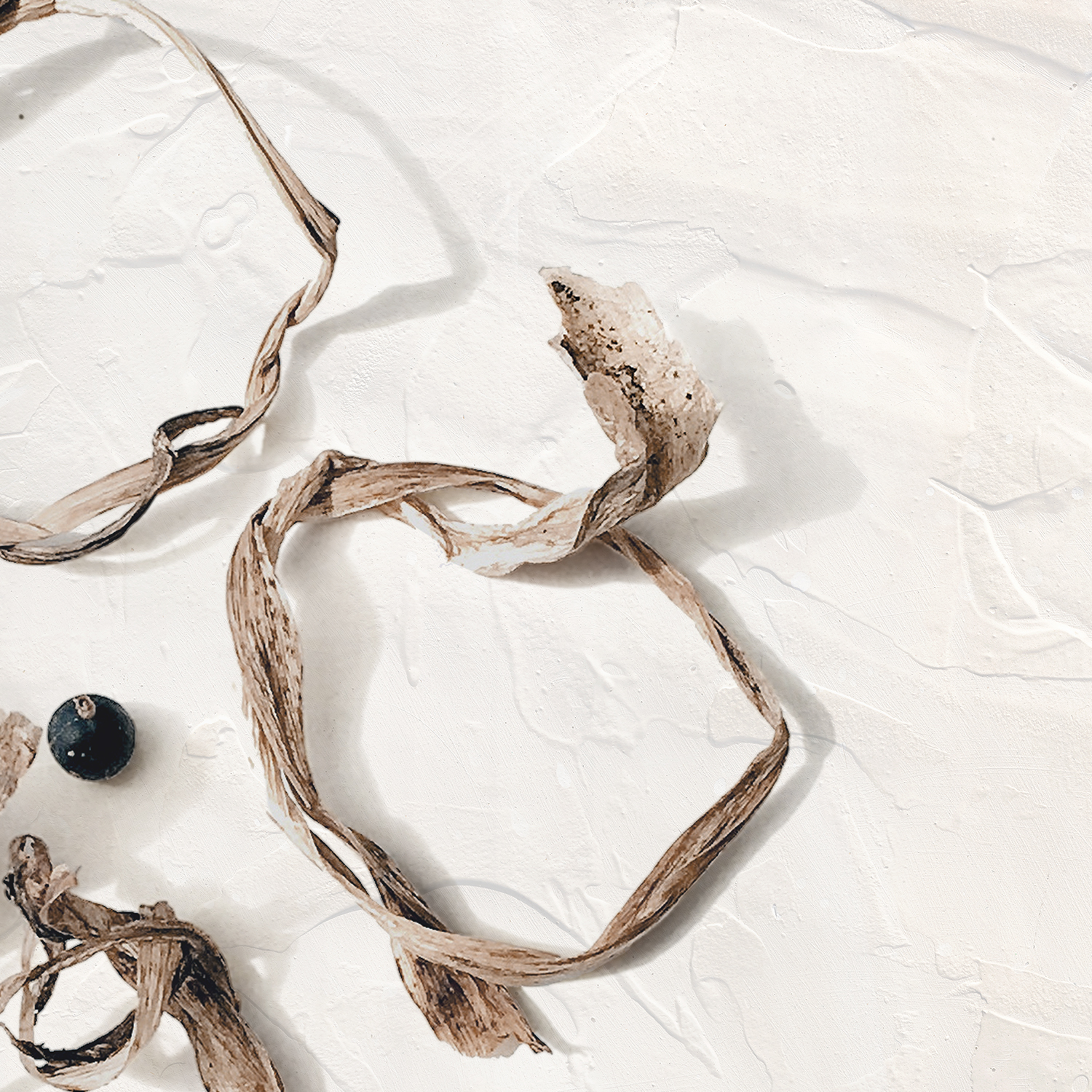 An arrangement of natural objects displayed in an interesting composition on a white textured ground. The layers, textures, and shadows bring a sense of dimension that has the items popping off the page.