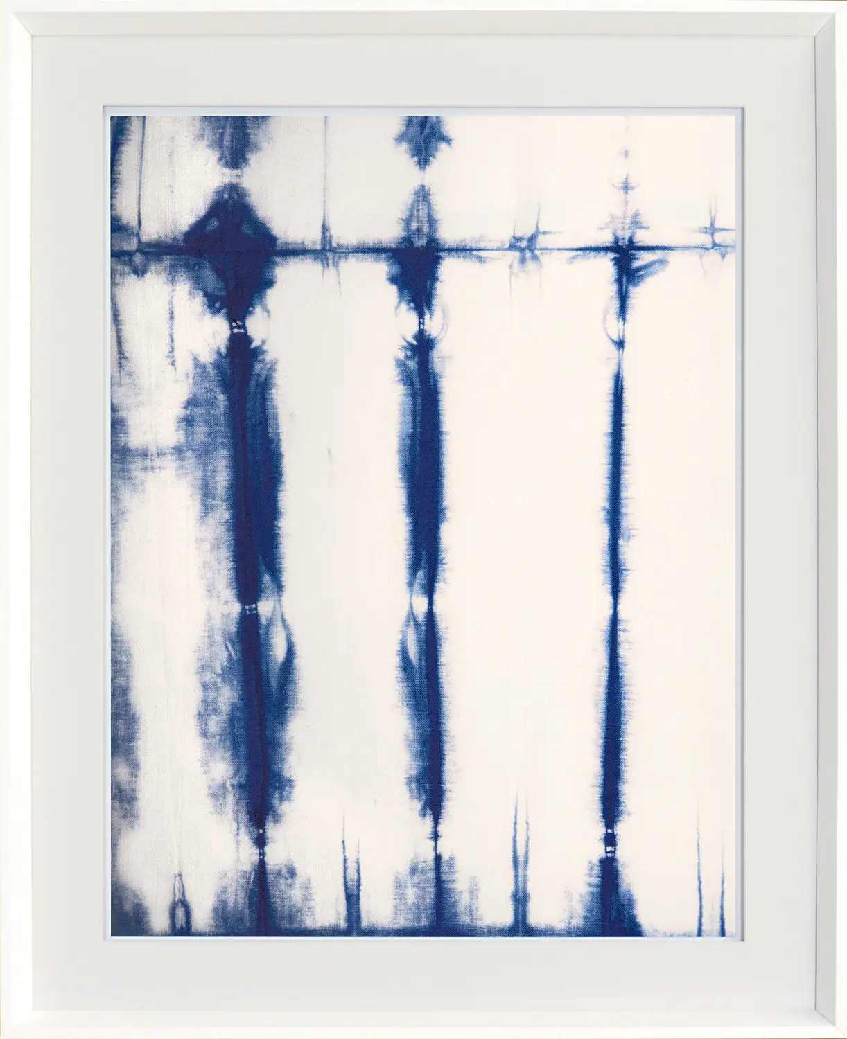 The japanese were the first to use resist dyed patterns in the 8th century. These patterns using indigo dyes are a graphic example of this ancient art. We accent them with a raised matte and a contemporary angled white frame.