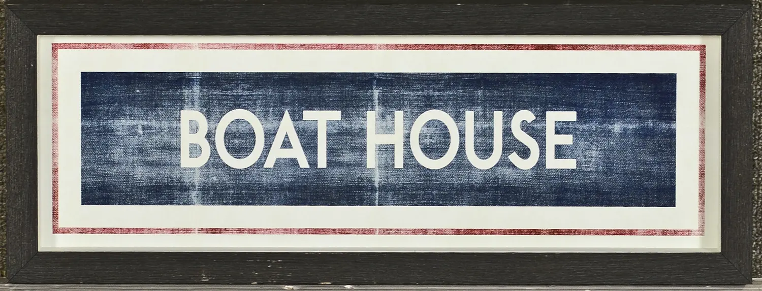A series of whimsical, retro, cottage signs using blue jean textures in a smart indigo, red and white colour scheme. Each is set in a deep profile, rustic frame. The series include cottage locales with their location co-ordinates as well as playful non specific ones. FIifteen variations available.